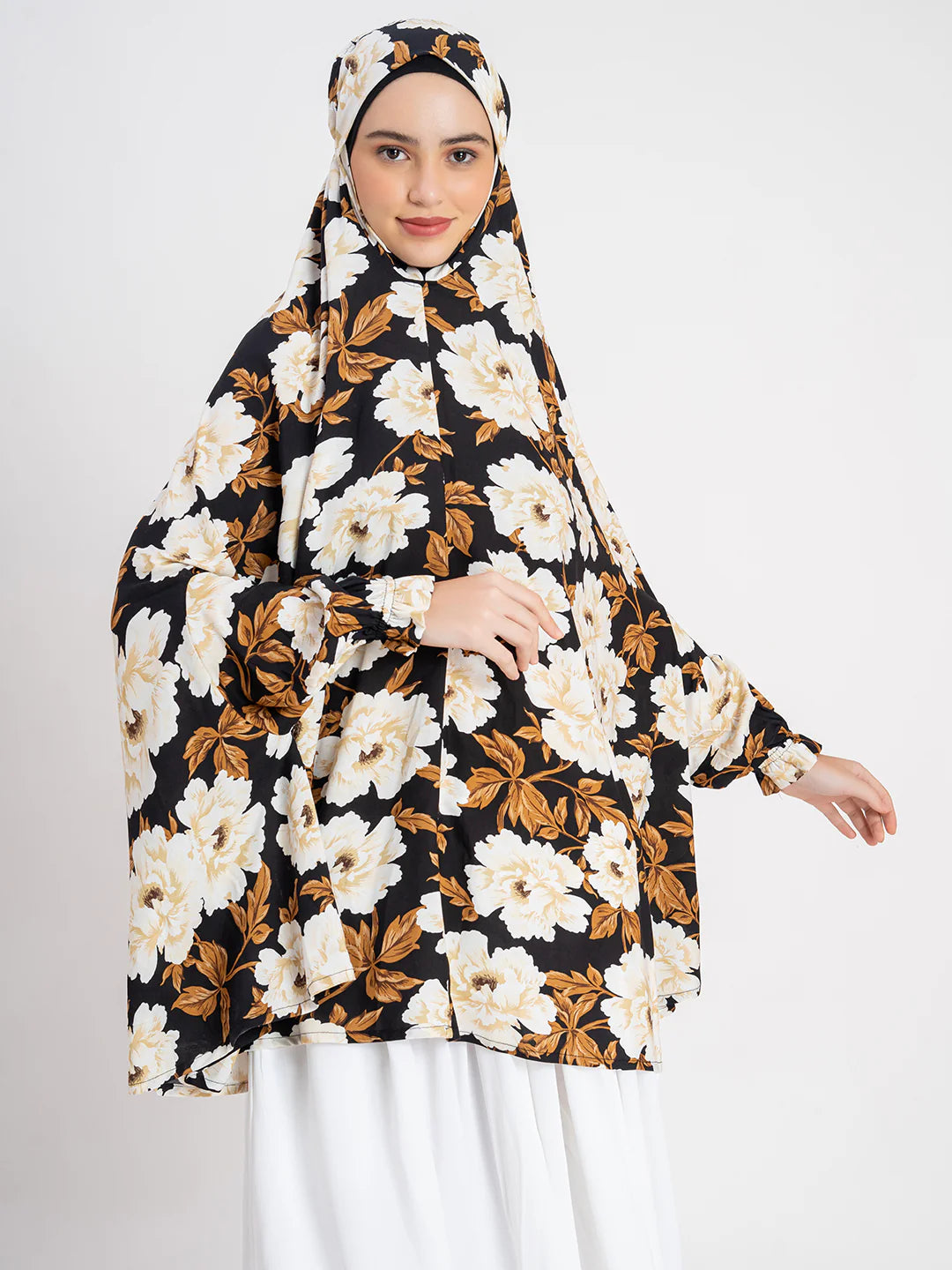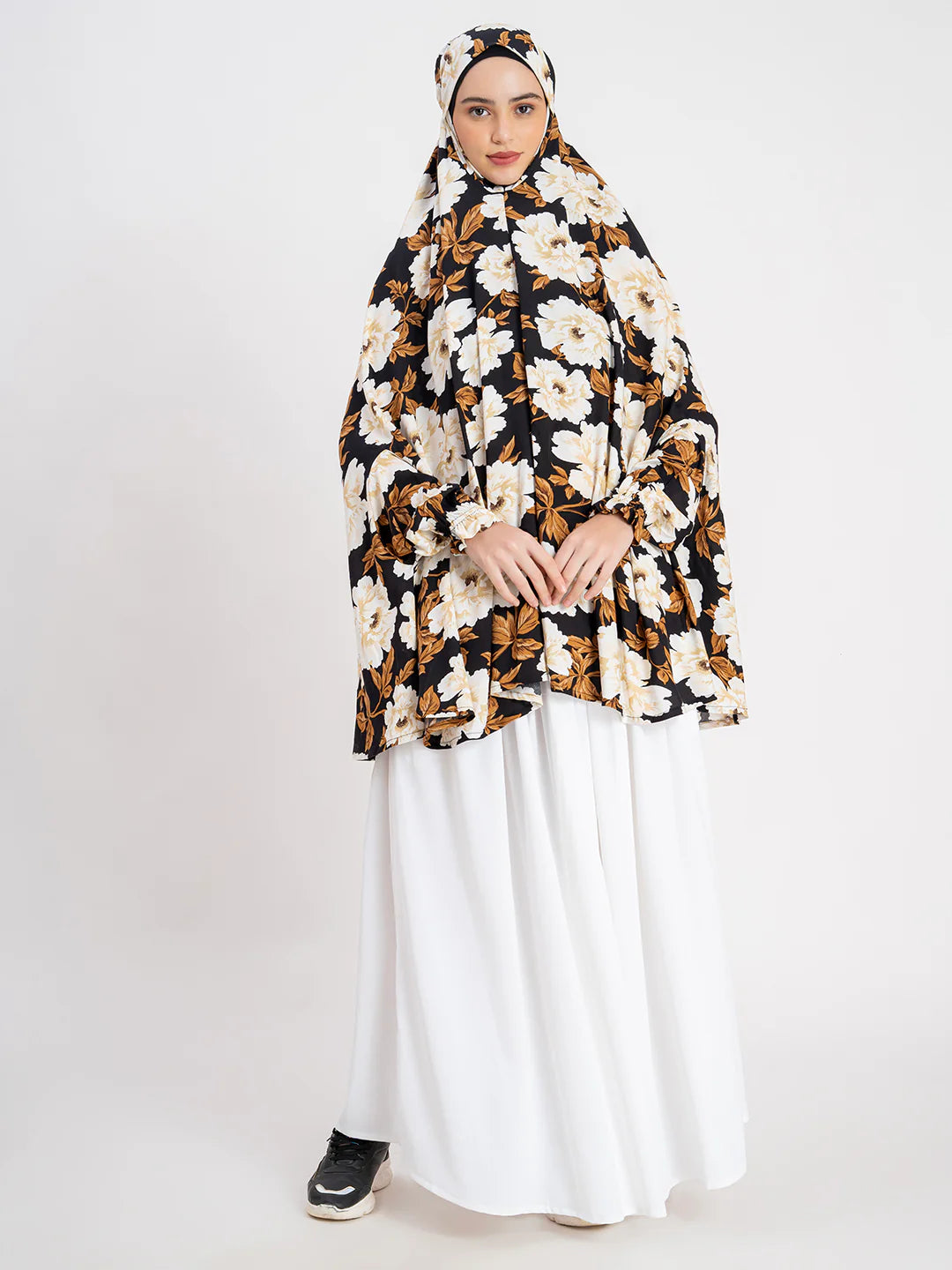 Floral Printed Long Sleeves Namaz Dupatta blends elegance with modesty. Featuring long sleeves for added coverage and a delicate floral print, it enhances your prayer attire effortlessly.