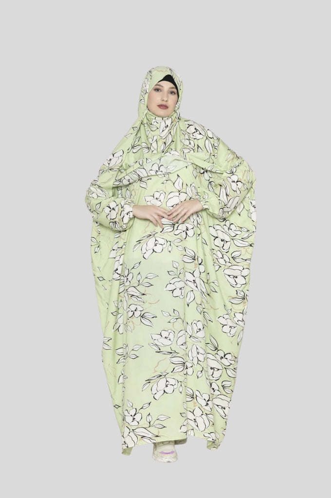 Elevate your prayer experience with the Leaf Print Prayer Gown Green White. Crafted from soft, breathable fabric, it offers the perfect blend of comfort and modesty. The delicate tresses add a touch of elegance, creating a serene atmosphere for your moments of devotion.
